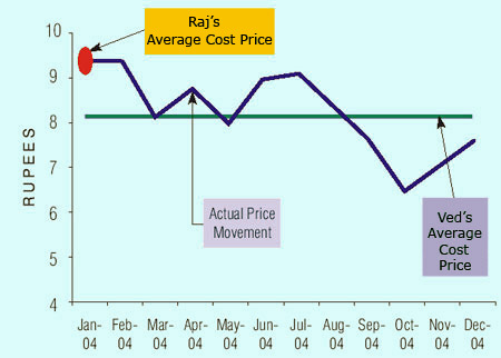 At the end of the 12 months, Ved has more units than Raj, even though they invested the same amount. That’s because the average cost of Ved ’s units is much lower than that of Raj. Raj made only one investment and that too when the per-unit price was high.